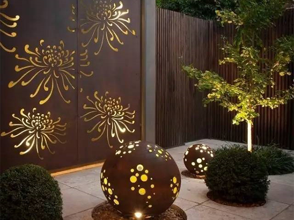 耐候鋼板會隨著時間的推移而變化,它的色彩明度和飽和度都高于一般的建筑材料,在庭院綠色植物的背景下很容易脫穎而出。此外鋼板銹蝕生產(chǎn)的粗糙表面使其結構在體積和質量上更加豐富。