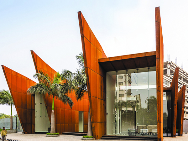 耐候鋼與普通鋼相比,具有較強(qiáng)的耐候性,是其作為立面材料的主要技術(shù)支撐。自然氣候條件下,耐候鋼通過(guò)加入鉻、鈮、鉬、磷、鈦等耐候性元素,在生銹層與基體之間形成致密的氧化物層,與基體金屬結(jié)合良好。因?yàn)檫@種致密氧化物薄膜的存在,防止空氣中的氧和水滲入鋼中,減緩腐蝕向鋼的深度發(fā)展,從而大大提高鋼的抗空氣侵蝕能力。